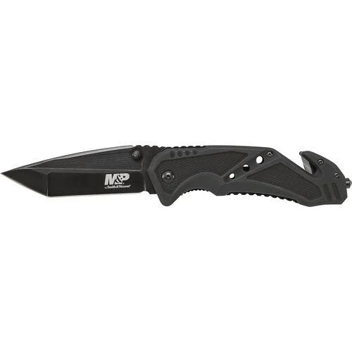 The M&P® M.A.G.I.C.® Assisted Opening Liner Lock Folding Knife is made with a black stainless-steel partially serrated clip point blade with ambidextrous thumb knobs and jimping. Its blue aluminum handle comes with black rubber inlay a safety lock a glass breaking tool and a pocket clip.