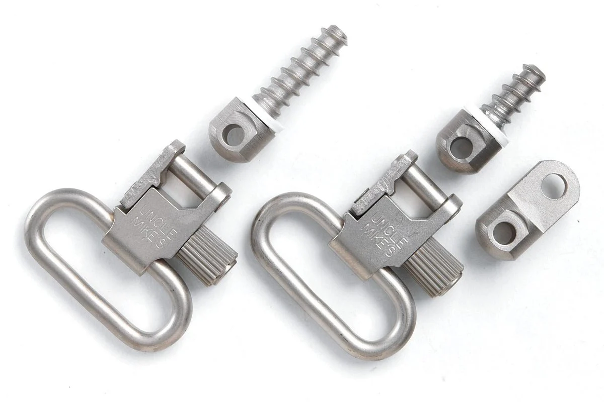 Now you can add sling swivels to your favorite pump or auto without altering your shot gun Uncle Mike’s new magazine cap swivel sets have a factory magazine cap with the swivel base already installed. Just unscrew the factory magazine cap and replace it with the new cap. For the buttstock a 3/4” woodscrew swivel base is included along with two super swivels.